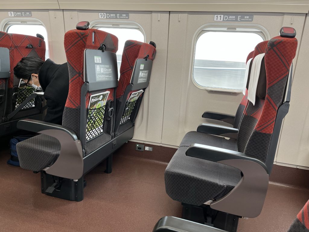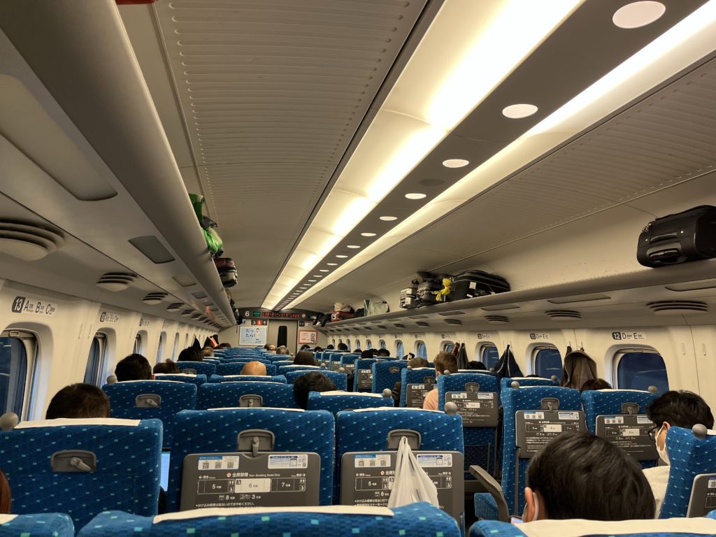 Ein paar Dinge sind uns aufgefallen: Bei der Einfahrt des Shinkansen in den Bahnhof ertönt eine bestimmte Melodie/Jingle – super lustig, denn so weiß man gleich, es kommt ein Shinkansen. Alle Sitzreihen schauen in Fahrtrichtung, die Sitzlehne kann verstellt werden und der Abstand zw den Reihen ist doch relativ groß. Der Schaffner verbeugt sich nach der Durchquerung jedes Waggons. Im Zug soll das Handy auf lautlos gestellt werden, es gibt eigene Telefonzellen. Raucherzellen gibts auch. In jedem großen Bahnhof wird der Shinkansen innen gereinigt.