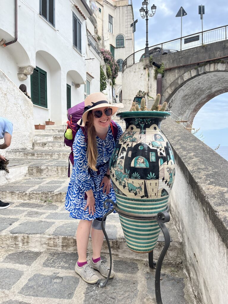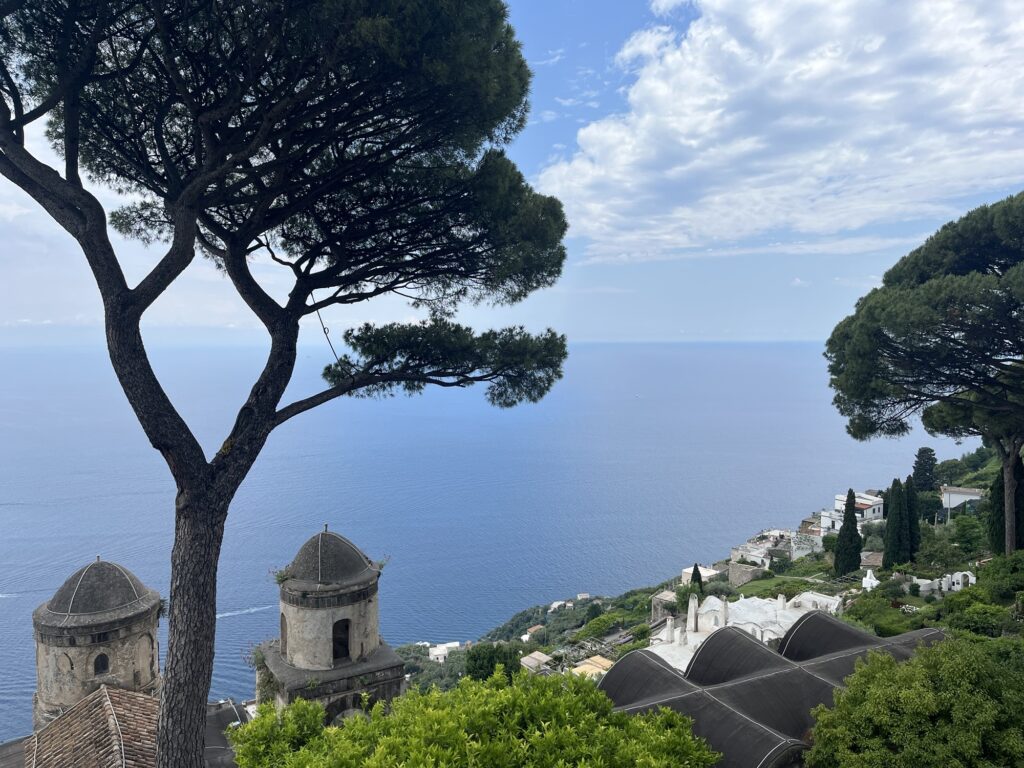 An Tag zwei sind wir mit dem öffentlichen Bus nach Ravello, einem Bergdorf in der Nähe von Amalfi, gefahren. Gleich vorweg, der Straßenverkehr entlang der Amalfiküste ist furchtbar. Wir würden jedem abraten, sich hier ein Auto auszuborgen. Der Verkehr fließt sehr langsam, es ist ein Stop-and-go, wenn man hupen hört, sollte man stehen bleiben denn dann kommt ein Bus um die Kurve, … , alles in allem eine sehr stressige Angelegenheit. Traurigerweise ist der ÖPNV (öffentlicher Personennahverkehr) nicht gut ausgebaut, auf manchen Strecken geht nur alle 2 Stunden ein Bus, in unseren Bus nach Ravello haben es nicht alle Wartenden rein geschafft. Das könnte man echt besser machen, vor allem weil es ja Verkehrsprobleme gibt.