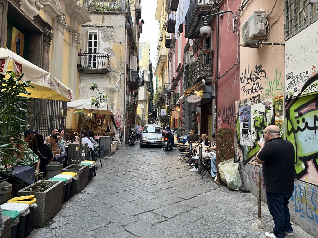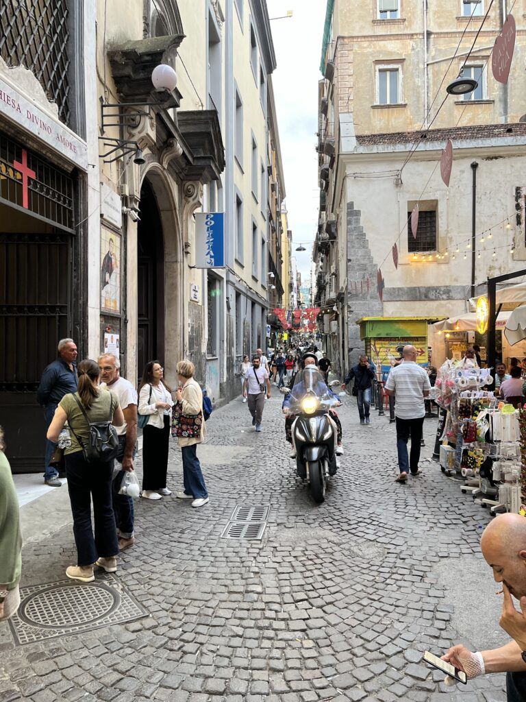 Aber auch dieses Mal haben wir in Neapel nach den Stationen in malerischen Ortschaften entlang der Küste einen richtigen Kulturschock erlitten und es hat uns anfangs leider überhaupt nicht gefallen: es liegt überall Müll auf der Straße und auf Müllcontainern stapelt er sich auch. In der historischen Innenstadt sind die Wände (auch von Kirchen) mit Graffiti beschmiert. Und in der Fußgängerzone fahren dauernd Motorräder und Autos an dir vorbei und hupen dich an, damit du Platz machst. Zebrastreifen sind hier eher eine Empfehlung, werden aber grundsätzlich eher ignoriert, die Leute gehen umgekehrt einfach über die Straße, es ist eine richtige Chaos-City. 😅
