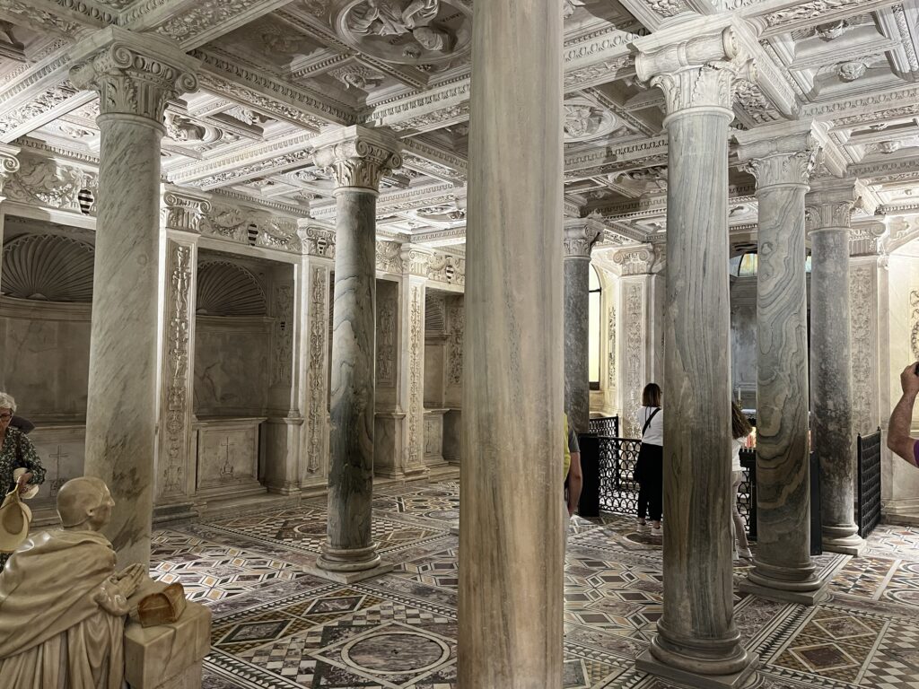 Den Freitag haben wir damit verbracht die historische Innenstadt zu erkunden. Neapel hat viele Kirchen zu bieten, vor allem der Dom ist riesig und zeigt, dass Neapel einmal eine sehr bedeutende Stadt gewesen sein muss. Unter dem Dom gibt es ebenfalls wieder eine beeindruckende Krypta (wenn auch nicht so toll wie in Amalfi und Salerno).