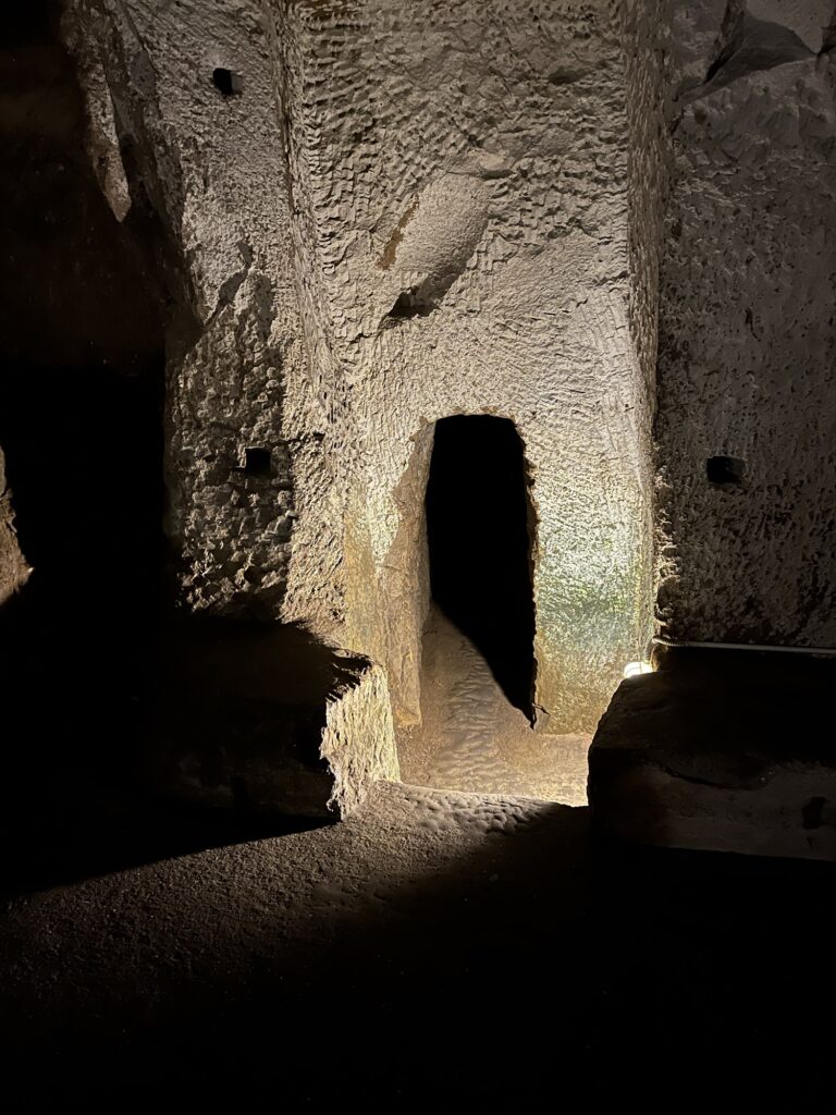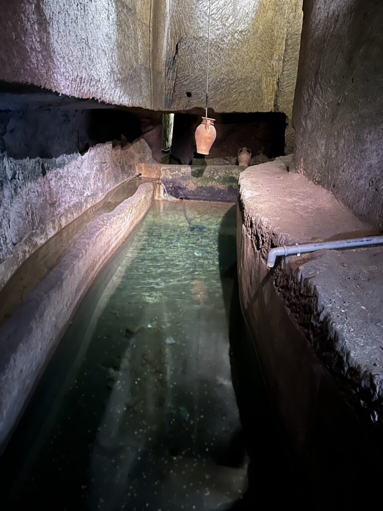 Neapel wurde ursprünglich von den Griechen erbaut (Neapel – Neapolis – Neu Polis), dann kamen die Römer und danach ist irgendwann das Königreich Neapel entstanden. Von den Griechen wurde ein riesiges unterirdisches Aquädukt erschaffen, dass unter Neapel verläuft. Das Material aus dem Aquädukt wurde auch gleich als Baumaterial für die damaligen Häuser verwendet. Im Rahmen einer Führung haben wir uns einen kleinen Teil dieses unterirdischen Aquädukts angesehen. War schon sehr cool, Platzangst darf man nur keine haben. An manchen Stellen zwängt man sich quer durch den Tunnel, ich musste auch den Rucksack abnehmen und vor mich halten, sonst wäre sich das nicht ausgegangen. Das Aquädukt war bis zum Ende des 19. Jahrhunderts in Verwendung – aufgrund eines Cholera-Ausbruchs wurde es dann geleert und die Verwendung eingestellt. Im. Zweiten Weltkrieg wurde das Aquädukt dann als Luftschutzbunker verwendet.