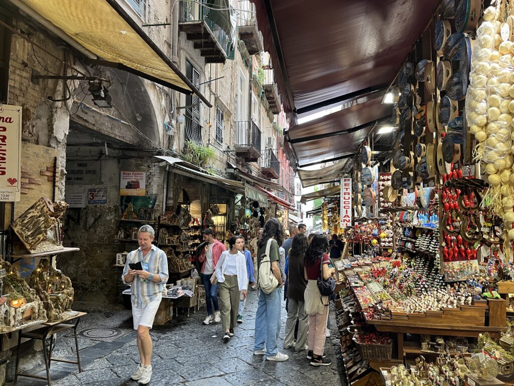 Relativ zentral in Neapel gibt es die “Krippengasse”, in der reihenweise Geschäfte sind, die Krippen und Figuren (alles eher religiös angehaucht) und aber auch generell Miniaturen für den eigenen Modell-/Krippen-/Landschaftsbau verkaufen. Dazu gehört auch Zubehör wie beispielsweise Stühle, Tische und Betten im Miniaturformat, Obstkörbchen, ein Wurstwaren-Verkaufsstand oder ein Holzhackblock. Michaela hat sich hier sehr wohl gefühlt und wir sind die Gasse sicher 5-6x entlang gegangen 😅. Natürlich haben wir auch ein paar Kleinigkeiten als Mitbringsel erstanden.