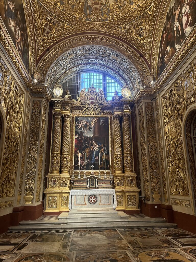 Beeindruckend war auch die St. John’s Co-Cathedral. Von außen eher praktisch aussehend wird man innen von Verzierungen und Schnitzereien überwältigt. Die ersten zwölf Großmeister des Malteserordens sind in der Krypta begraben und auch den Boden des Gotteshauses zieren die Grabtafeln von über 400 Rittern.